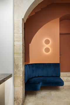 Our interior design for Capital Suites Bar creates a refined yet vibrant ambiance, blending rich textures with a bold color palette. Deep blue and warm orange tones contrast beautifully against soft beige, while plush velvet seating and elegant marble surfaces add a touch of luxury. Thoughtful lighting and curated details enhance the space’s sophisticated yet inviting atmosphere, making it the perfect destination for stylish social gatherings.